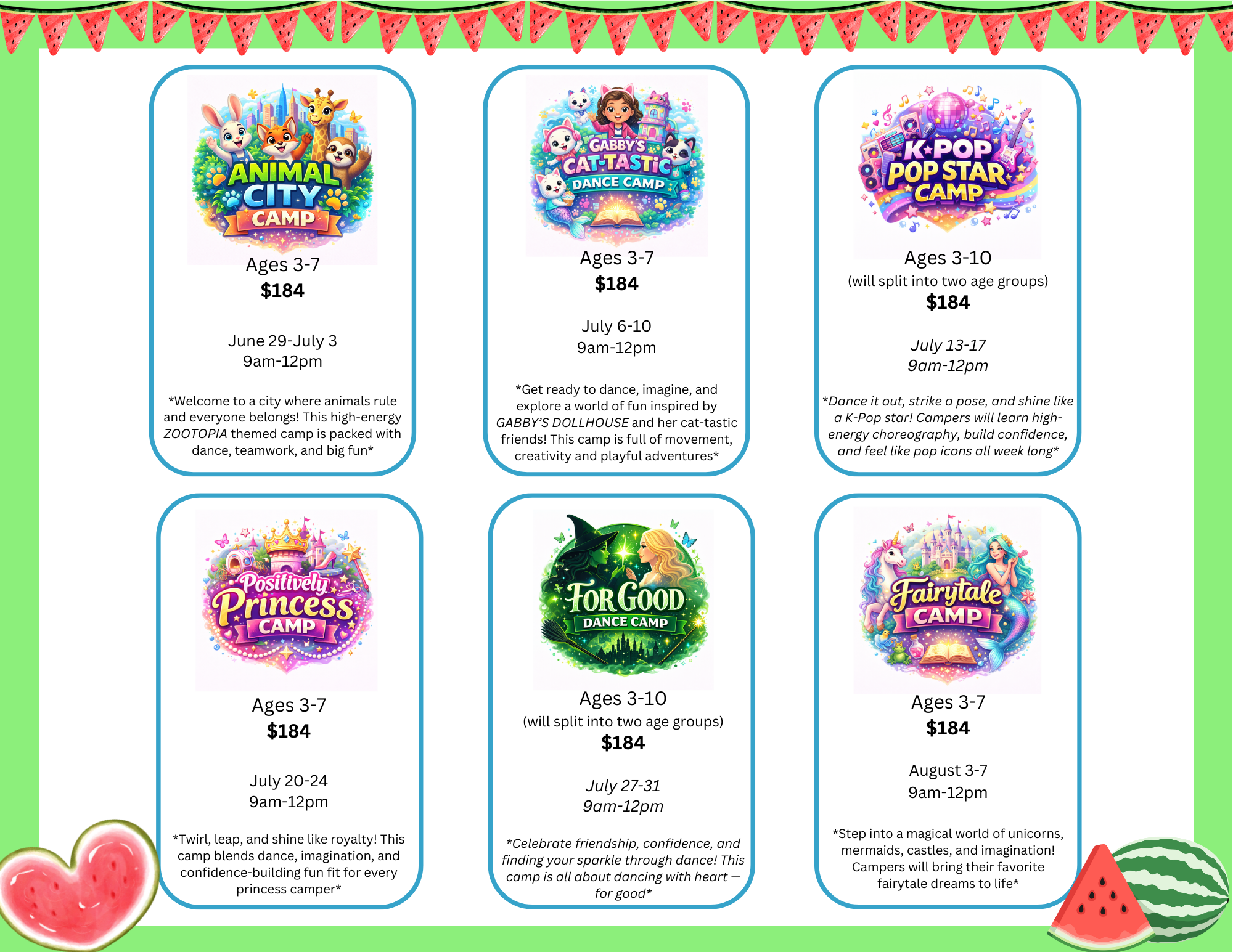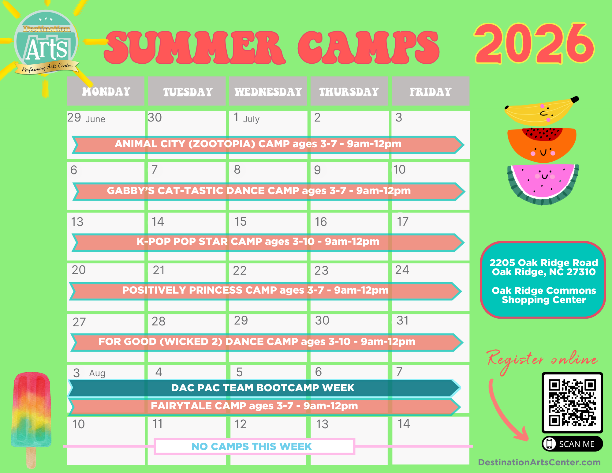 Destination Arts reserves the right to cancel or combine if camp or class minimums are not met. You will be contacted and credited for any payment made.