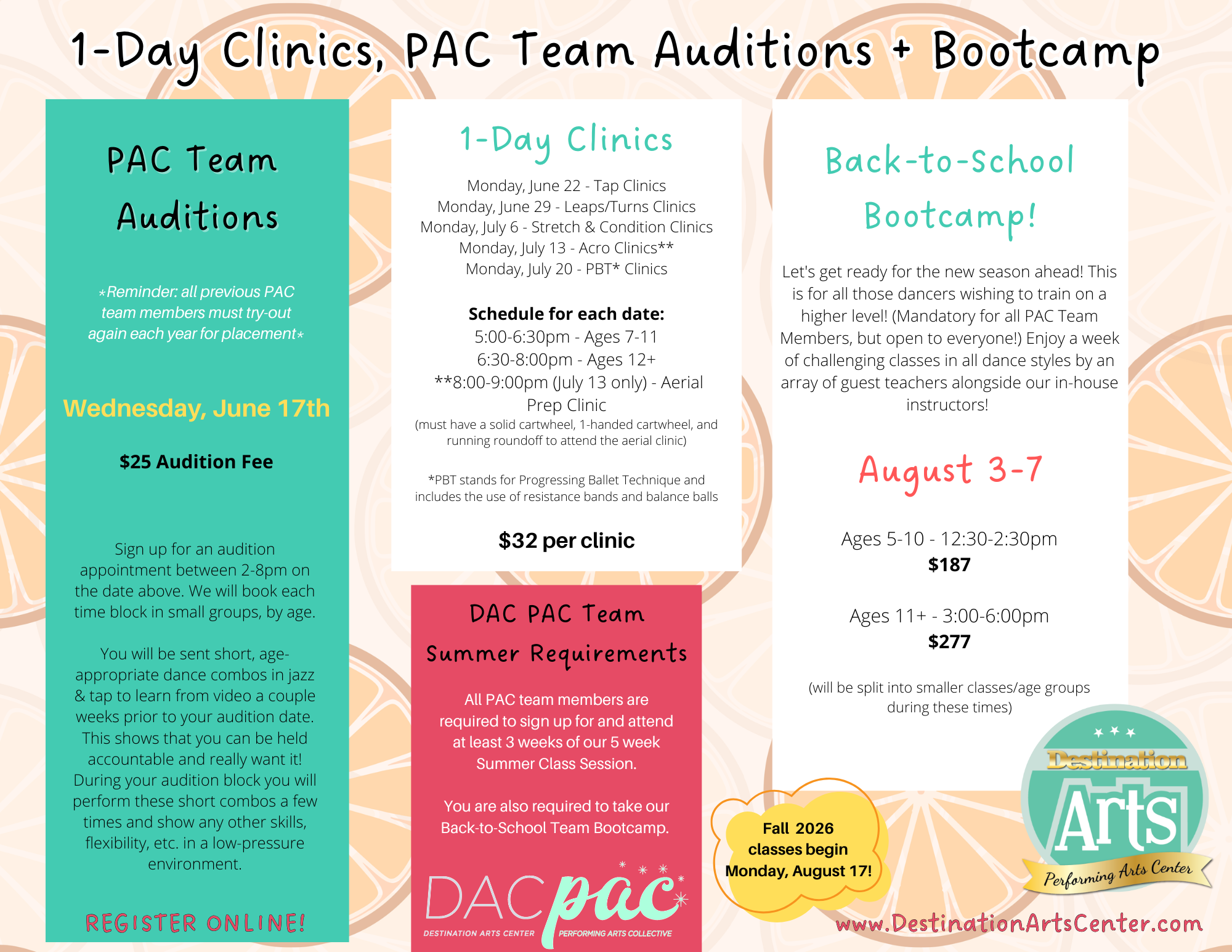 Summer Camps, Classes, One-Day Clinics, DAC PAC Team Audition Info, and Private Music Lessons in voice, piano or guitar!